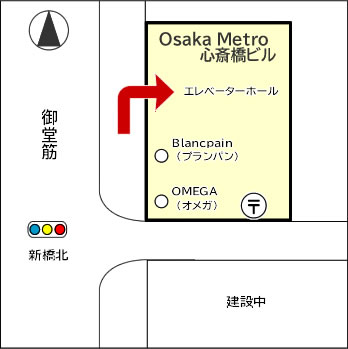 地下鉄御堂筋線「心斎橋駅」北側改札から北10番出口で地上に上がり、御堂筋を北上。郵便局、OMEGA、Blancpainが入っているビルの2階です。